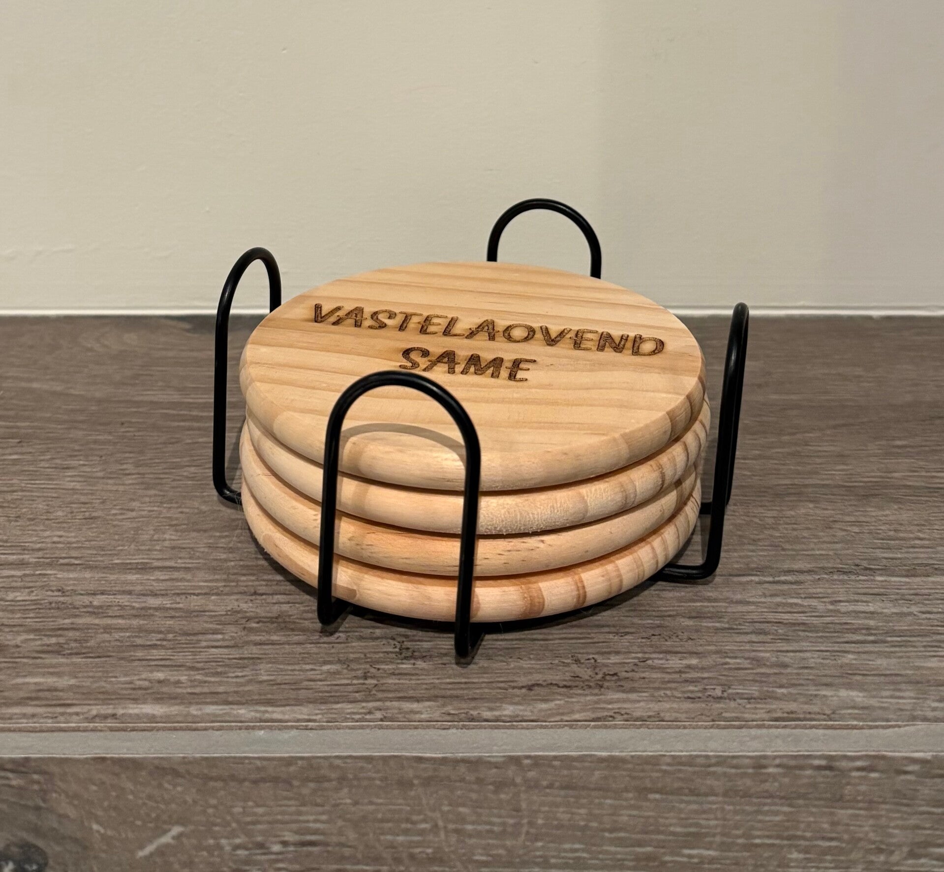 Je krijgt de onderzetters in een handige houder voor op tafel.