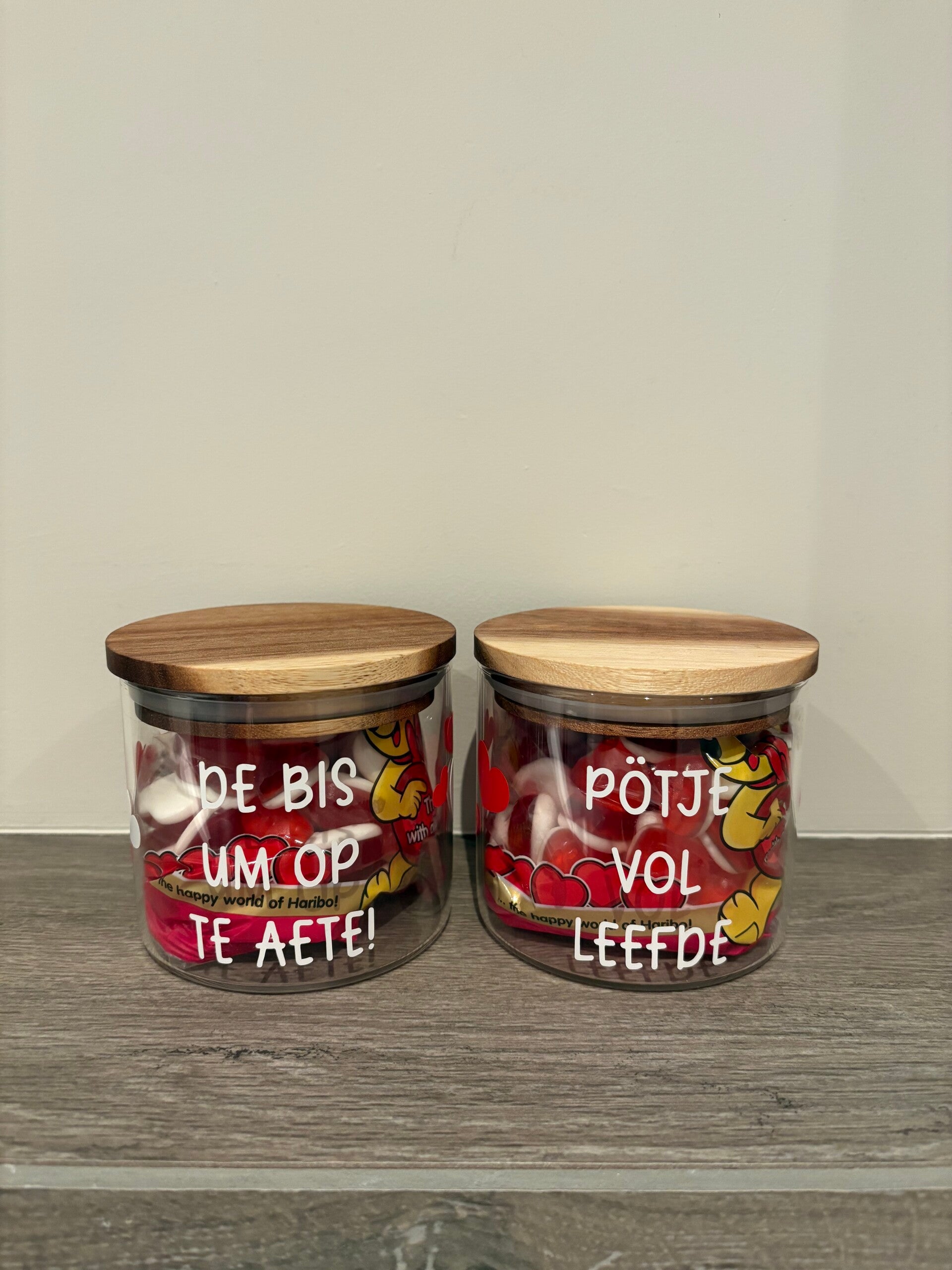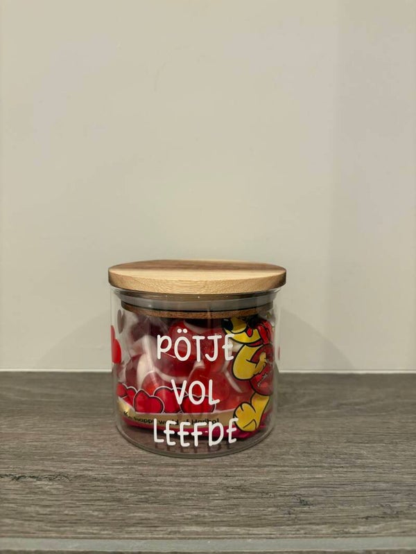 Deze glazen snoeppotjes (450 ml) zijn gevuld met lekkere hartjes en voorzien van een vrolijke Valentijnsboodschap in het Venlose dialekt.